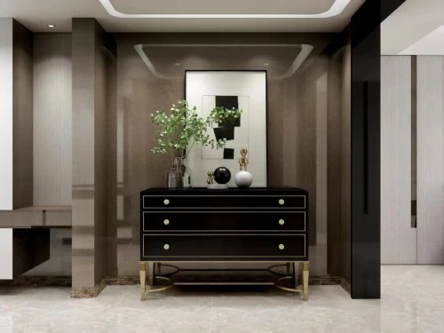經典鋼琴黑色玄關柜,平直的線條,錐形桌腿間搭配馬蹄鐵造型金色橫檔,將藝術糅合于空間,黑白色抽象裝飾畫與黑白色藝術擺件,為現代居室平添別樣魅力。