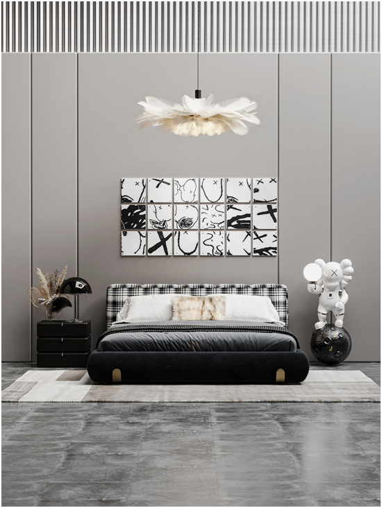 一張洛品有家卡薩系列軟體床,搭配色調(diào)一致的床頭柜,勾勒臥室的藝術(shù)感。充滿意式簡奢風(fēng)格的黑色線條釋放出無拘無束、放松舒適的態(tài)度,讓原本的空間不再單調(diào)。