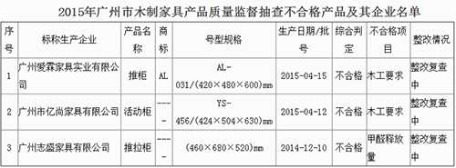 另外,廣州愛(ài)霖家具實(shí)業(yè)有限公司生產(chǎn)的一款推柜、廣州市億尚家具有限公司生產(chǎn)的一款活動(dòng)柜木工要求不合格。