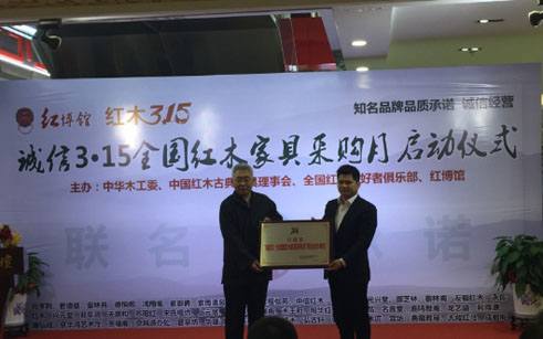 中華文化促進(jìn)會(huì)木作工作委員會(huì)主任趙夫瀛主任在致辭中分享了木工委等機(jī)構(gòu)共同倡議發(fā)起本次誠(chéng)信月系列活動(dòng)的初衷,對(duì)紅博館一直以來(lái)引領(lǐng)紅木行業(yè)誠(chéng)信經(jīng)營(yíng),文化創(chuàng)新等方面做出的努力與貢獻(xiàn)作出肯定。隨后,他為紅博館頒發(fā)“誠(chéng)信315全國(guó)紅木家具采購(gòu)月聯(lián)合主辦單位”牌匾。