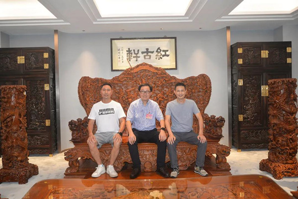 市人大常委會副主任關瑞麟(中)與紅古軒創始人吳赤宇(右)、紅古軒生產廠長李仲良(左)落座紅古軒家具合影