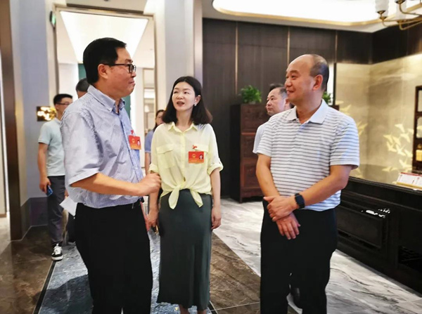 中山市紅古軒家具有限公司營銷總監楊晶(中)陪同領導嘉賓參觀紅古軒中式美學空間