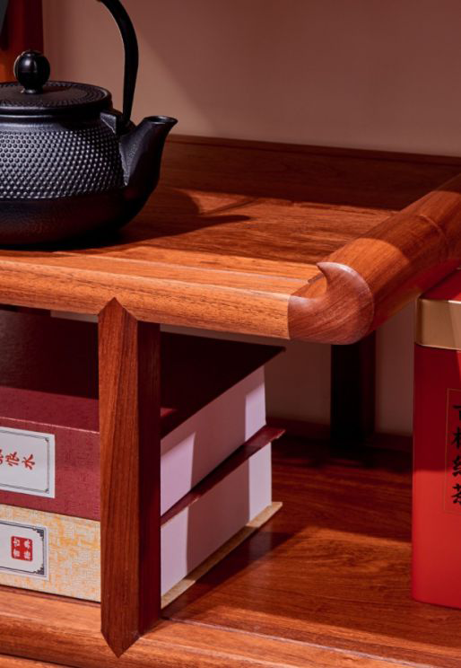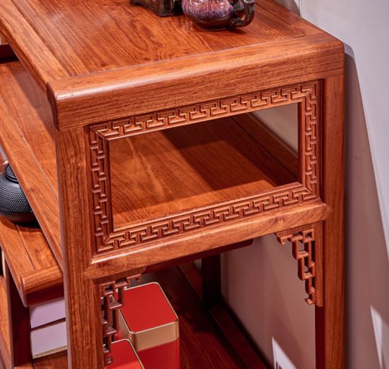 茶臺整體不采用一釘子一鐵,純榫卯的設計,使得茶臺在實際使用中堅固無比。同時更好地保護紅木的木質結構。
