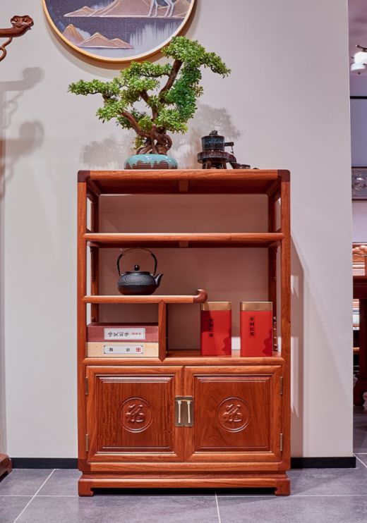新中式茶水柜設計感十足,茶水柜兩側雕刻回形紋,以及鏤空設計,遠看樸素,近觀卻設計感滿滿。