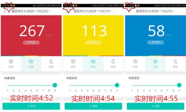 為了測試這臺霍尼韋爾空氣凈化器的功能,我不惜點燃了一盒“滅蚊片”做測試!相信很多人都見識過滅蚊片!一旦點燃,即刻變有刺鼻的濃煙蔓延整個房間!可奇妙的是:滾滾的濃煙和刺鼻的氣味,仿佛還沒來得及讓我看清、聞到,就已經(jīng)被凈化器吸收、過濾了!凈化器感應(yīng)之靈敏,令我咋舌!點燃滅蚊片后短短一分鐘時間,凈化器就爆亮起“紅燈”!PM2.5數(shù)顯高達365!煙霧并未來得及發(fā)散便被凈化器強力吸入,可見吸力之大;吸入的煙霧絲毫也沒有在上部出風(fēng)口排除,可見凈化效果之強。