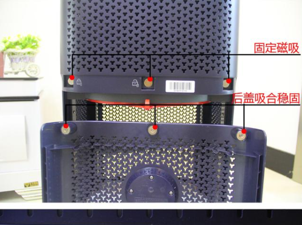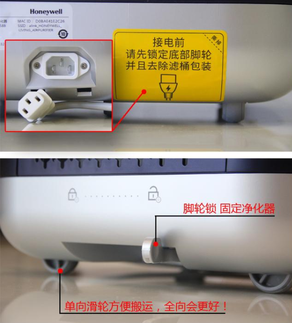 霍尼韋爾的小設(shè)計也是非常貼心和感人的。機器后蓋采用“磁石吸附”的設(shè)計,濾網(wǎng)鎖緊把手就位后,后蓋底部卡入小孔,輕輕往上一合,六塊磁石自然牢牢吸附,后蓋的安裝就完成了。非常省力。非常人性化的警告提示,防止在機器使用前誤操作。我剛拿到機器時根據(jù)常識去除了濾芯的保護膜,然后翻來覆去的找電源線接口,很巧妙的隱藏在黃色警示標貼后面。AT--X3還采用了腳輪鎖止設(shè)計,腳輪鎖打開時,可以直線方向很輕松地移動空氣凈化器,更換擺放位置;腳輪鎖就像汽車的手剎,鎖住時能防止工作期間滑動,也可避免孩子誤撞到空氣凈化器導(dǎo)致機器滑行。