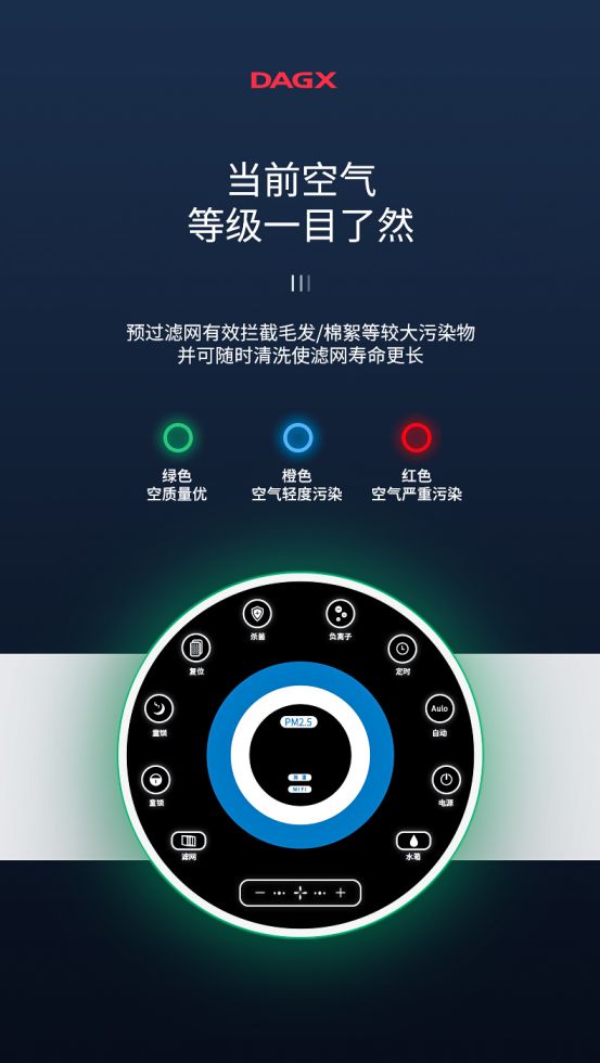 關閉空氣凈化器后,室內PM2.5濃度快速上升;就算夜間至凌晨閉緊窗門,自凈化器關閉后的3小時內,室內PM2.5濃度仍會不斷上升至4-5個單位??蒲羞€表明,室內污染物并不是僅有PM2.5一種,長期閉緊窗門,室內二氧化碳等濃度提高,和開啟各種各樣電器產生的微量臭氧,都將會危害身體健康。狄格DAGX空氣凈化器運用多方面復合濾網,對于不一樣污染物一層層過濾。