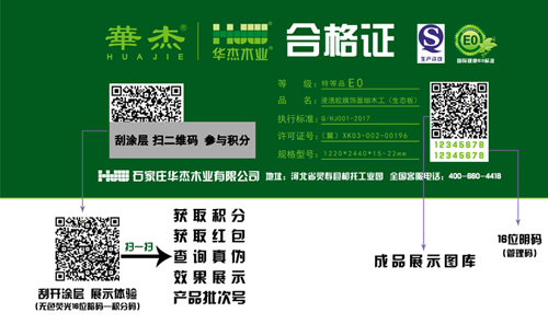 事實上,在每一張華杰木業生產的板材上,都有華杰木業的防偽涂層碼,只需刮涂層掃碼,不僅能夠識別真假還能贏取紅包和積分等,進一步保障了客戶的合法權益。當然,市面上也有一些品牌跟隨著華杰木業的腳步,在他們的板材身上也附有防偽涂層碼,這一定意義上來講,華杰木業成為板材行業的引路者,不斷引導著板材行業規范化、有序化之道。