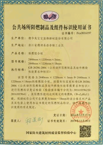 兔寶寶環(huán)保型難燃膠合板,以優(yōu)質原木單板為原料,經(jīng)阻燃處理、干燥、調(diào)膠、布膠、組坯、冷壓、熱壓等生產(chǎn)工藝加工而成。產(chǎn)品的阻燃性能、抑煙性能和煙氣毒性達到國際GB8624-2012《建筑材料及制品難燃性能分級》B1級阻燃材料的要求,同時符合國際GB20286-2006《公共場所阻燃制品及組件燃燒性能要求和標識》的規(guī)范要求;產(chǎn)品還保持了傳統(tǒng)人造板產(chǎn)品優(yōu)良的物理學性能、加工性能,可貼、裁、釘、鉆、漆、刨或任意使用自攻釘、槍釘和直釘進行加工,韌性優(yōu)越,不易斷裂。