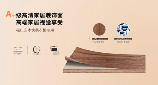 為了適應福慶實木快裝衣柜的發展需求,福慶實木快裝衣柜在新產品中采用高清家居裝飾紙,打造更符合家居產品的原木自然色彩。