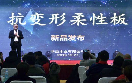 營銷總監祝善明先生上臺做主題發言,新產品發布會包括兒童房專用板材系列、新輔材系列、智能家居產品和年度戰略新產品——抗變形柔性板。