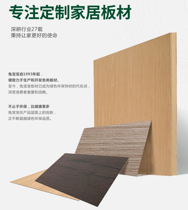 兔寶寶在1993年成立,經過二十多年的磨練, 公司從單一的裝飾貼面板生產到多元化產業格局,公司生產和銷售各類板材、地板、木門、衣柜、櫥柜、兒童家居、木皮、膠粘劑、五金、墻紙墻布、集成墻面等產品系列的完整產業鏈。同時以“用戶體驗”為導向,構建“全品類、全系列、全功能、全風格”的互聯網+時代的全新產品體系。這么多的產品,家里裝修都不用到處跑,認準兔寶寶板材一家全搞定!