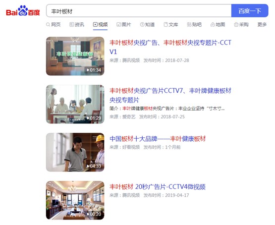 在閱讀過文字版的報道后,我們不妨再通過視頻版展示來進一步了解豐葉板材。在視頻板塊的搜索結果中,我們看到了愛奇藝、優酷、騰訊視頻、好看視頻等數十家人氣視頻網站的熟悉身影,可見豐葉板材已與這些流量型平臺達成了戰略合作,以視聽結合的方式為自身的品牌廣告片推廣奠定下高覆蓋性傳播的基礎。