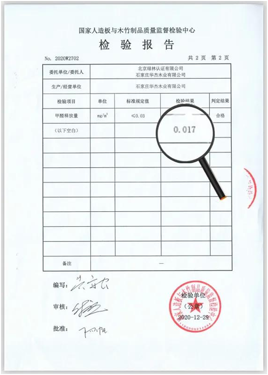 早在今年1月初,華杰板材就通過了由中國林產(chǎn)工業(yè)協(xié)會制定的團體標準《無醛人造板及其制品》無醛級的質(zhì)量要求≤0.03mg/m3,經(jīng)檢驗中心檢測,華杰板材基材甲醛釋放量低至0.017mg/m3,獲得無醛認證證書。