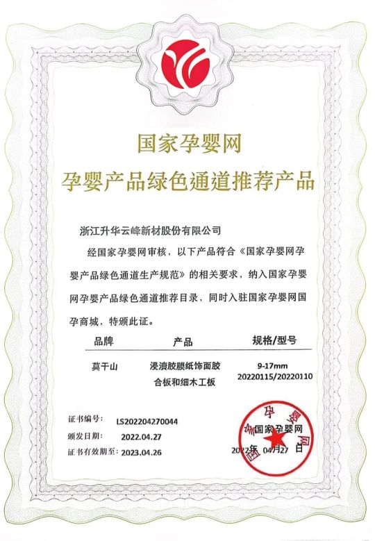 如何做到品質始終如一?莫干山以實力作答。2020年,莫干山板材獲得中國環境標志產品認證和“兒童安全級產品”認證。2022年,莫干山浸漬膠膜紙飾面膠合板和細木工板、實木復合地板先后被納入國家孕嬰產品綠色通道推薦目錄,同時獲得了“國家孕嬰網入網推薦證書”,這意味著莫干山的環保品質達到新高度。