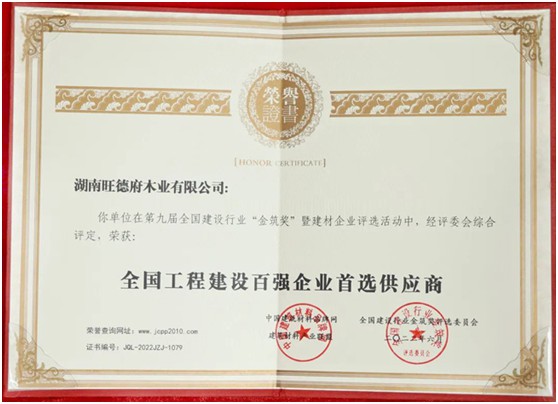 品牌引領高質量發展,標桿掀起新變革浪潮。近日,從中國建筑材料品牌網、全國建設行業金筑獎評選委員會傳來喜訊:湖南旺德府木業有限公司從眾多參選企業中脫穎而出,榮膺“全國工程建設百強企業首選供應商”稱號,旗下萬象品牌杉木芯生態板榮膺“全國綠色建材品牌”稱號。這是對萬象品牌實力的肯定,更是對旺德府企業實力的高度認可。