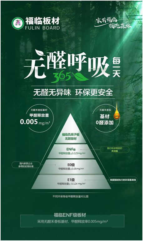 對于福臨而言,板材產品高于ENF級環保標準并非特例,早在2018年,福臨負離子板的環保等級就遠超業內推崇的E0級。新征程上,福臨板材將繼續堅持高標準、嚴要求、更環保,穩步發展自身綜合實力,用優質的產品回饋消費者的信任,為人們筑好“無醛健康家”。