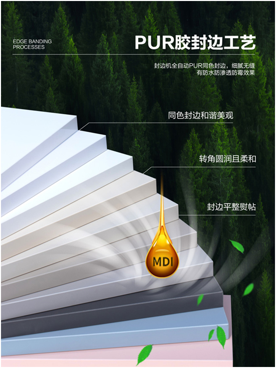 PET飾面與超強刨花板相結合,配合成熟的壓貼工藝,打造出新一代完美無瑕的家具柜門板。由于PET飾面樹脂材料自身的特性,造就了PET飾面的耐酸堿、耐腐蝕、耐黃變、耐磨損等各方面非常穩定的性能,讓產品使用壽命更長。