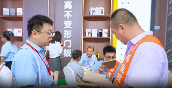 工作人員現場介紹世界蕞高不變形門板,這是板芝福家居今年的爆款產品,高達5米,一門到頂,無需拉直器,不開裂,不變形,外觀簡約又大氣。
