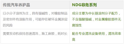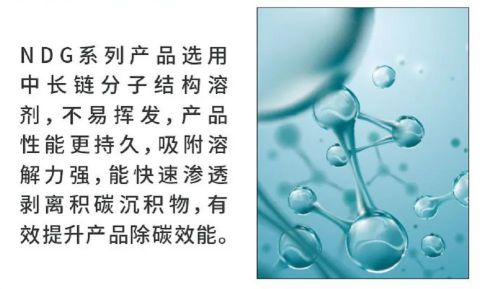 同時,NDG系列產(chǎn)品擁有精準(zhǔn)的濃度配比,由精選胺型溶劑及環(huán)保型溶劑等互相融合,能在確保產(chǎn)品的清潔除碳性能優(yōu)異的前提下,大幅度提升安全性及其環(huán)保特性,真正達(dá)到對汽車的科學(xué)養(yǎng)護(hù)。