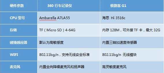 在安霸最新的7系CPU中,360選用的A7LA55定位中端偏高,支持1296P@30fps,極路客G1選用的海思Hi3516C支持1080@25fps。在存儲方面,360行車記錄儀以TF卡的方式存儲,最大支持64G,而極路客G1雖然有內存128M,但支持TF卡容量僅有32G,從中可見,主控芯片還是非常重要的(高端的主板往往支持存儲規格更高)。而在其他方面,兩者幾乎沒有本質區別。