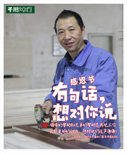 湖北生產基地門扇車間拼枋組阮海燕:人生天地,常懷一顆感恩的心!感謝父母的養育之恩!感謝朋友的理解和包容!感謝千川公司給我就業平臺, 讓我可以在自己的家鄉努力工作,好好生活。