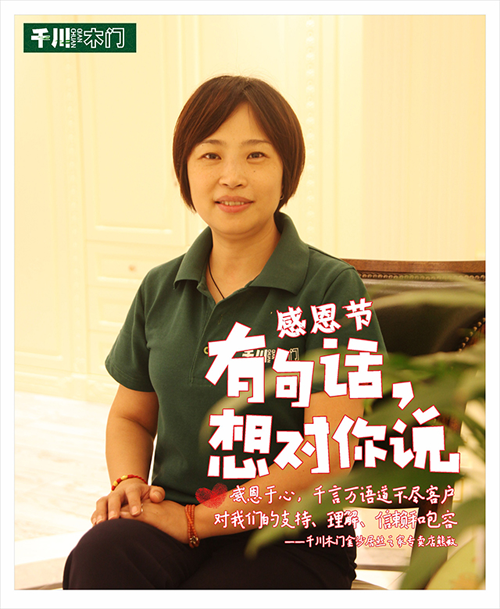 千川木門:懂得感恩的人是幸福的、快樂的,千川也想借此機會,對所有奮斗在崗位上的工人、導購、后勤、安裝師傅等所有千川人,以及所有關心千川的各級領導、千川客戶說一聲:謝謝您。正是有了你們的辛苦付出和支持,千川才能不斷向前快速發展,才能不斷獲得新的成就,才會擁有更美好的明天。