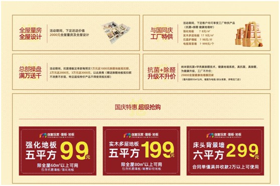 (二)實木多層地板:199元/五平方米(限全屋80㎡以上可用,包含抗菌墻板/除醛彩繪地板)