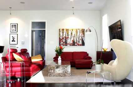這款廳室中紅色的皮質沙發是視覺的重心,它巧妙地將空間的氛圍挑動起來,讓住在里面的人感受家的溫暖和內在的力量。與黑色木地板的搭配,正是經典的紅與黑,復古時尚的格調自然散發。