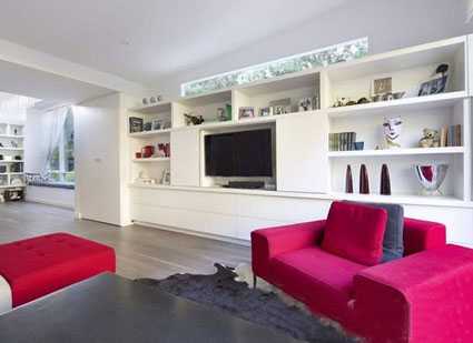 整面墻的白色電視機柜搭配淺棕色的木地板,建立空間的純凈感,鮮紅色的沙發則提亮了空間基調,以鮮明的色彩強烈的充斥著人們的視覺。陳列柜中的裝飾藝術品提升著空間的情趣感。