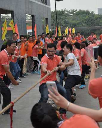 運(yùn)動場上,最矚目的要數(shù)參與度最高的拔河比賽。參賽隊隊員們個個摩拳擦掌,躍躍欲試。隨著一聲哨響,拔河比賽正式開始,比賽中參賽隊員雙手緊握長繩,大家都鉚足了勁兒、全力拼博,隨著長繩子上紅色錘線的左右移動,場外加油聲、吶喊聲、口號聲、歡呼聲連成一片,場面頗為壯觀。