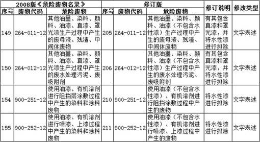 而在這部未出臺的《名錄》,新聞報道提到,經過中國涂料工業協會多次與相關國家部委反應呢的情況,根據收到的國家工信部節能司“關于征求《國家危險廢物名錄(修訂)》(報批稿)意見的函”,在最近新修訂的《國家危險廢物名錄(修訂)》(報批稿)中,將涂料生產和使用環節產生危險廢物的條目中加入“不包括水性漆”的括號注釋,即水性涂料生產和使用過程中產生的廢物將不被列為危險廢物。其具體項請看: