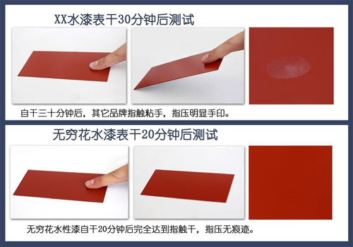從圖上我們可以明顯看出干燥方面的對比,好水性漆表干只需要20分鐘就可以,差的水性漆指觸手印明顯。