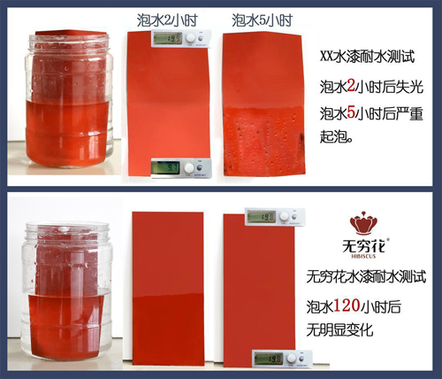 圖4中明顯的看出水泡后的對比,耐水指標是水性漆的一個關(guān)鍵性指標,因為好多客戶噴涂都是在室外,面臨著施工后短時間內(nèi)遇到下雨,這是考驗水性漆好劣的一個關(guān)鍵性指標。有的水性漆用水泡2個小時就失光,5個小時后就起泡。