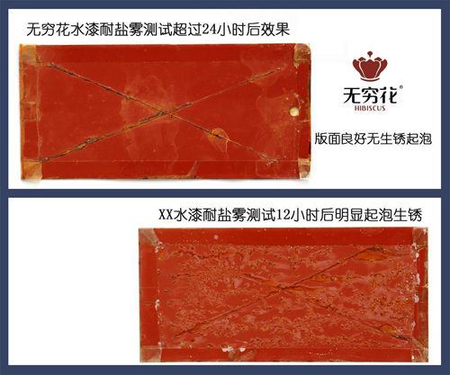 圖3中從鹽霧測試中可以明顯看出差的水性漆鹽霧不到12小時就明顯起泡生銹,好的水性漆24小時后板面良好無異常。