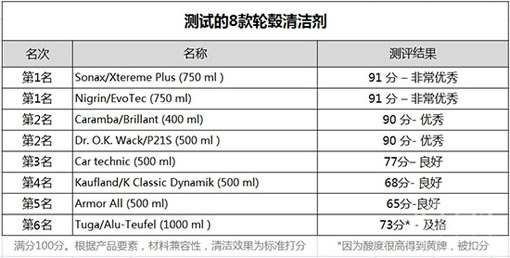 2015年3月1日,DEKRA1(德國機動車監督協會)和AUTOBILD2(汽車畫報)專門組織了一場專業的輪轂清潔劑效果測試。測試使用8款輪轂清潔劑對16個鋁制輪轂進行清潔,并在兩位德國相關專家的現場見證下進行。測試結果如下: