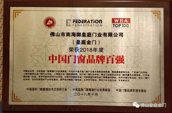 經過12年的發展壯大,皇庭金門的實力有目共睹,2018年10月30日,中國國際門窗幕墻技術交流研討會,中央藍海門窗幕墻發展聯盟,中國門窗品牌百強委員會給皇庭金門頒發《中國門窗百強》企業稱號!