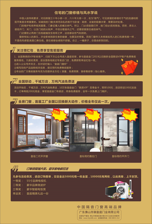 新歲更迭,家人好友歡聚一堂,分享一年的喜悅與收獲。在象征福氣與好運(yùn)的農(nóng)歷豬年即將來(lái)臨之際,“中國(guó)十大門窗品牌”皇庭金門特別呈現(xiàn)時(shí)下熱門單品與新春特別系列,為摯愛(ài)親朋送去時(shí)尚祝福,更精心策劃“以舊換新”繽紛贈(zèng)好禮活動(dòng),誠(chéng)邀消費(fèi)者一同樂(lè)享新春,刮起新春的環(huán)保綠色風(fēng)暴!