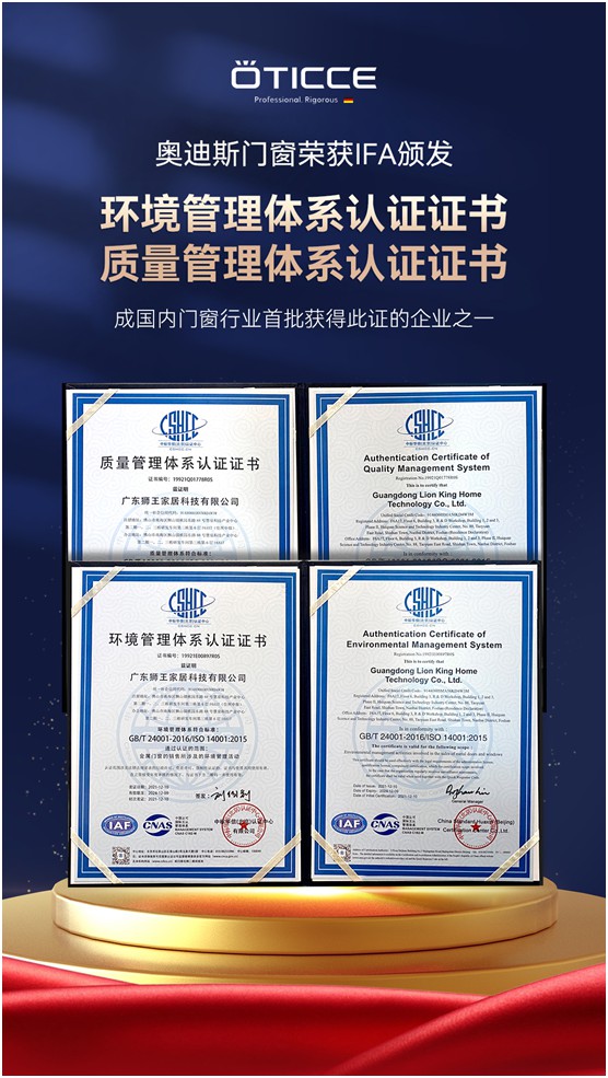 除此以外,奧迪斯門窗還歷經多次科學、公正、嚴格的檢驗、審查及復核評審環節,榮獲權威IFA認證機構頒發的環境管理體系認證證書和質量管理體系認證證書,證明奧迪斯門窗在質量管理和環境管理上達到國際水平,不僅有利于國內市場發展,更有助于向全球市場拓展,讓中國質造走向世界。