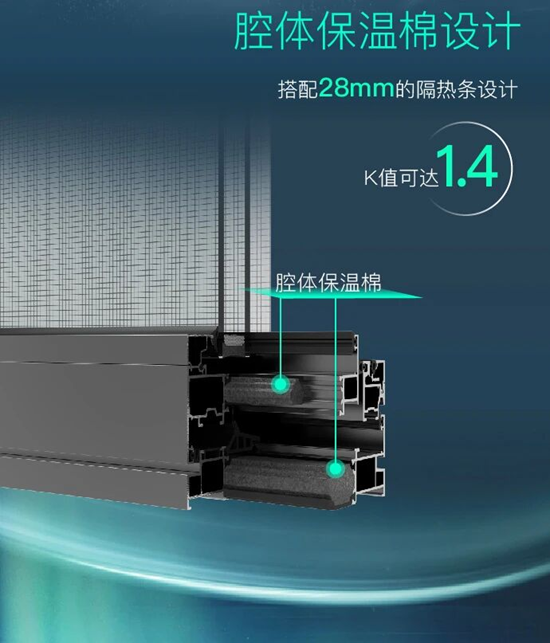 Delta95內(nèi)開窗采用復合多腔體結(jié)構(gòu)設計,搭配28mm的隔熱條和腔體保溫棉設計,K值可達1.4,具有出色的隔熱保溫性能。