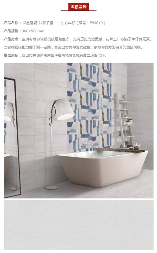 當然,雪狼瓷磚的好產品遠不止于此。陶博會開幕前和開幕后,其新品12星座瓷片被陶瓷資訊、華夏陶瓷網等媒體鼎力推薦,“四大文明”仿古磚也適時上市,被譽為非常有文化品位的產品。