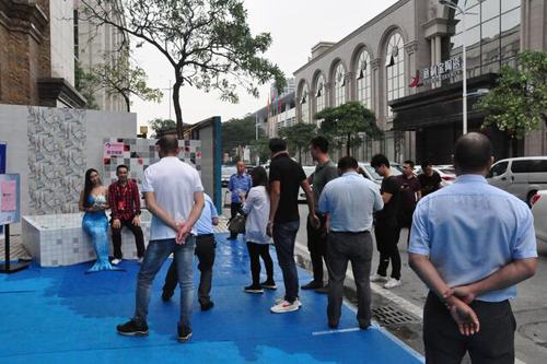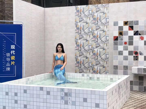 好營銷根植于好產品。陶博會期間,雪狼瓷磚用“雙零吸水率”不透水瓷片鋪貼的水池和特色瓷片打造的廚衛模擬間在總部展廳大門外驚艷亮相,是行業里首次將瓷片當泳池磚用和提出“廚衛磚家”概念的品牌。別出心裁的水池、廚衛模擬間與美人魚、廚房美女交相輝映,引得路人紛紛駐足觀賞,舉起手機不停拍照。