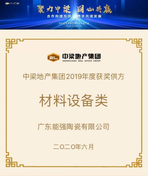 2020年6月16日,能強(qiáng)陶瓷受邀參加中梁地產(chǎn)集團(tuán)2020年度供應(yīng)商大會(huì),并憑借雄厚品牌實(shí)力、過硬的產(chǎn)品品質(zhì)、創(chuàng)新優(yōu)質(zhì)的營銷服務(wù)獲得中梁地產(chǎn)集團(tuán)授予的“優(yōu)秀戰(zhàn)采合作供方”榮譽(yù)。
