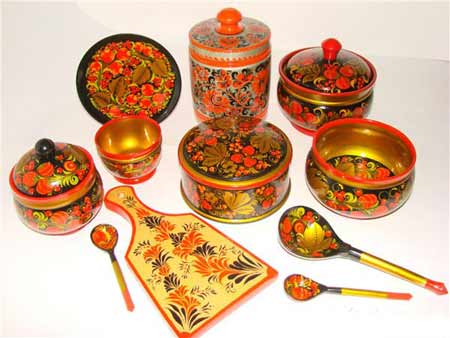 在俄羅斯的紀念品商店,經常能看到這種繪有繁復植物圖案的木制工藝品,這種黑金版小清新就是有名的霍赫洛馬裝飾畫風格。這種風格的工藝品最早出現在下洛夫哥羅德州的小村莊霍赫洛馬,常見于各種木制餐具和家具,一般都是植物主題。不知大家有沒有發現,俄羅斯的許多工藝品,哪怕內容小清新,但都能做出土豪金的feel ~