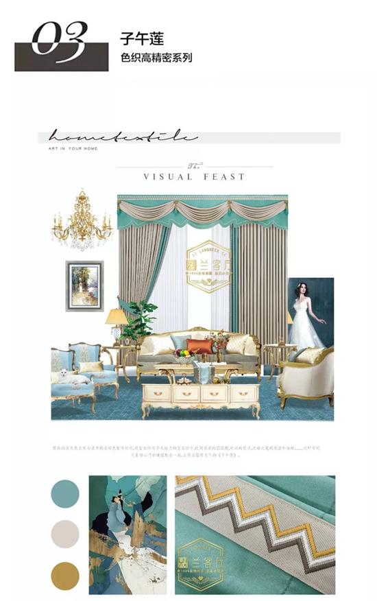 雅致的淡灰色主布與清秀的淡綠色配布相稱,造型獨特而不失魅力的里層拉平,比例完美的圓圓幔,時尚的花邊,點睛之筆的花盤和吊球…這所有的元素精心巧妙地搭配在一起,設計成這款儒雅大氣的《子午蓮》。
