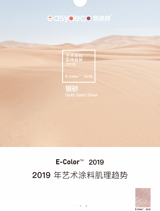 盡管在藝術(shù)涂料中間,易涂得已經(jīng)有很成熟的肌理類型,可是每一年易涂得都會推出新一年度我們認為將代表新流行的質(zhì)感和紋理。2019年易涂得認為,或者說易涂得新推出了一個叫做年度肌理,或叫做年度質(zhì)感,這個質(zhì)感我們稱之為銀砂,很顯然砂色或砂的質(zhì)感,是一種很鮮明的自然肌理,很好地呼應了以上的三個色彩主題,雅致的、精致的、自然的。在銀砂質(zhì)感底下,發(fā)布了一系列與之相匹配的顏色,共同推出了10個之多,銀砂系列的白砂色、杏砂色、桃砂色、海青色、珊瑚色、蜂蜜金色、托帕石色、青砂色等,一系列從綠的帶有森林感,帶有像我們吃的食物,像杏的顏色或象牙顏色,總共發(fā)布以上10個顏色。