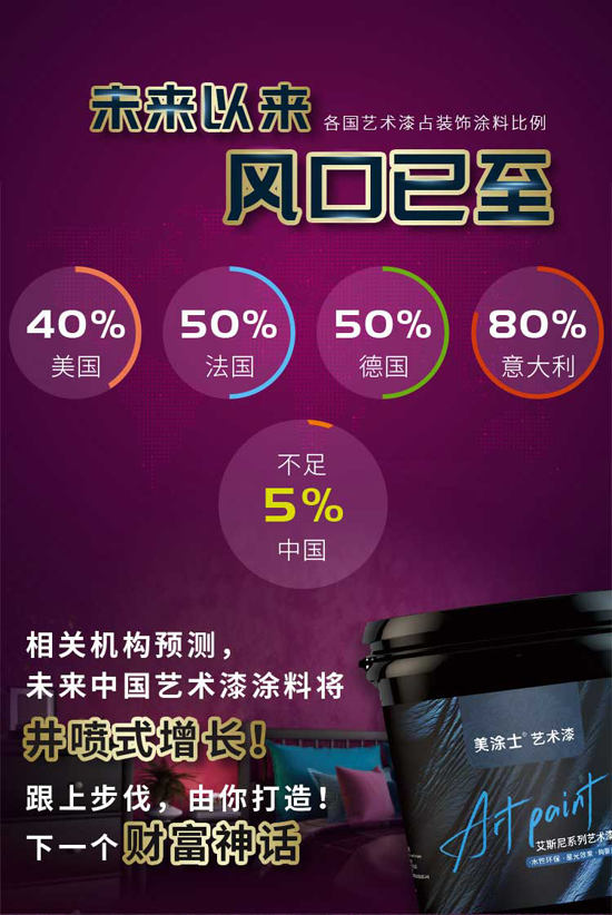 從數據來看,藝術涂料在裝飾涂料中的比例目前在美國為40%,在法國為50%,在德國為50%,在意大利為80%,在中國不到5%。根據相關機構的預測,中國藝術涂料的未來發展將是爆炸性的,中國藝術涂料市場規模很大,市場發展空間廣闊。