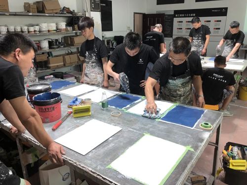此次帝卡斯商學(xué)院藝術(shù)涂裝工匠班為期四天三夜,教學(xué)工藝涵蓋卡瑪拉、艾維斯、威尼斯、愛琴海、溫莎絲絨等,更有新品阿爾卑斯、布拉諾、蠶絲絨、可可細(xì)砂、微水泥等工藝教學(xué),讓工藝學(xué)習(xí)貼近日常工作,更加貼近市場,而且每件教學(xué)作品在造型、技藝等方面都有所創(chuàng)新,更是體現(xiàn)了帝卡斯不斷精進(jìn)、研發(fā)后的提升效果。