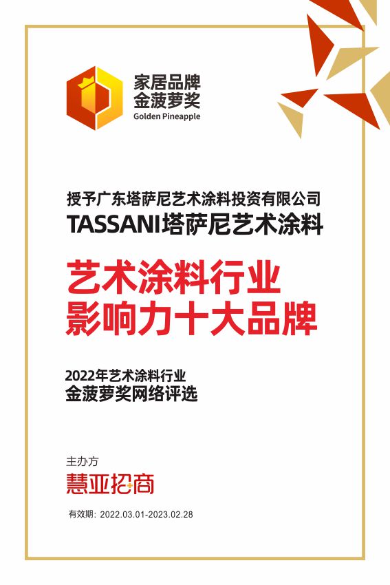 珠玉在前。近日,由慧亞招生網主辦的“中國家居品牌金菠蘿獎”榜單揭曉,該獎項至今已經舉辦11年,收到過百萬家居行業經銷商關注參與,被譽為家居行業含金量最高的獎項,更成為行業的風向標,同時也是經銷商精選優質好品牌的重要參考。意大利TASSANI塔薩尼藝術涂料憑借優秀的品牌綜合實力脫穎而出,榮獲【藝術涂料行業影響力十大品牌】獎項,可謂雙喜臨門!