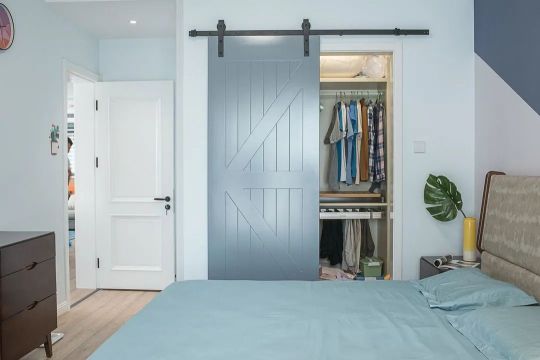 主臥墻體沒有改動,衣帽間單獨隔離出來,增加一扇谷倉門。谷倉門貼合墻面,不占用空間,使用也很靈活。